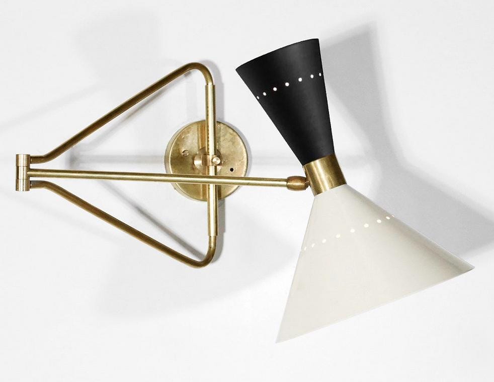 This beautiful Stilnovo Style Adjustable Italian Diabolo Cone-shaped Swing Arm Wall Light is a perfect blend of mid-century modern and contemporary design. The sleek brass frame features a unique curved shape that creates a warm and inviting glow when illuminated. The sconce is designed with a single adjustable arm, allowing you to direct the light where you need it most. It's perfect for adding a touch of elegance and functionality to any room in your home, from the living room to the bedroom or hallway. This wall sconce is not only visually appealing but also durable and built to last. The brass construction ensures long-lasting performance and a modern aesthetic that complements various interior styles.