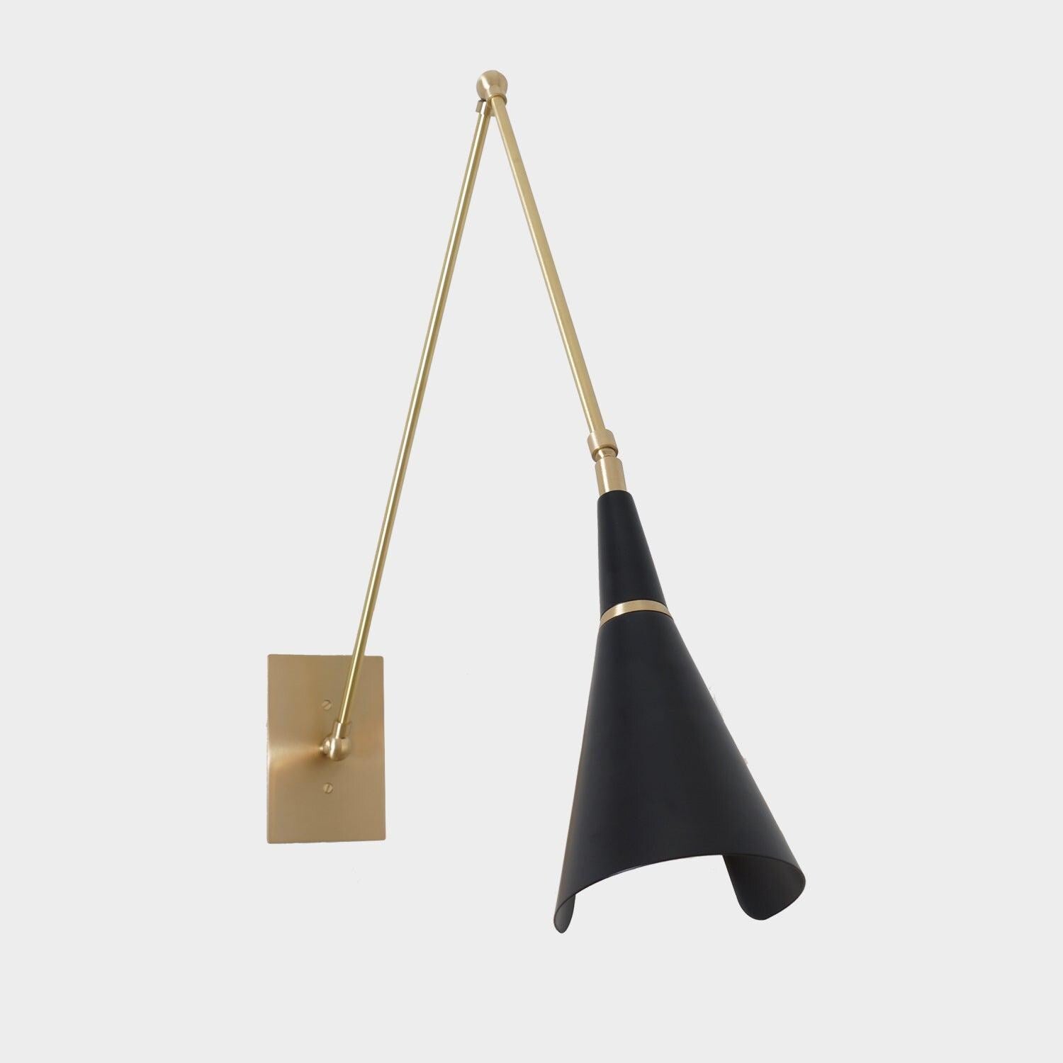 The articulating arm and pivoting shade offer customizable positioning, ensuring both task lighting and ambient illumination. Crafted from solid brass, this sconce exudes durability, while the hand-lacquered shade, available in a variety of colors, adds a sophisticated touch to any space.