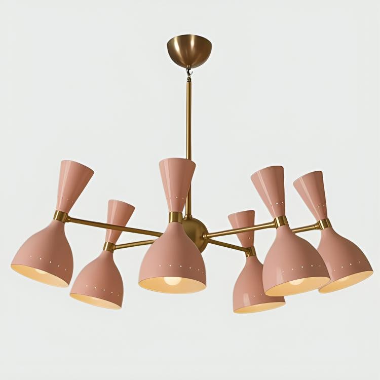 Elevate your space with this stunning mid-century modern chandelier, inspired by the iconic Stilnovo design. Featuring six adjustable dual-cone metal shades in a sleek retro style, this chandelier allows you to direct light exactly where you need it. The elegant brass hardware adds a touch of sophistication, while the perforated details create a warm, diffused glow. Perfect for dining rooms, living spaces, or entryways, this statement lighting piece blends vintage charm with modern functionality. Ideal for mid-century, contemporary, or eclectic interiors.